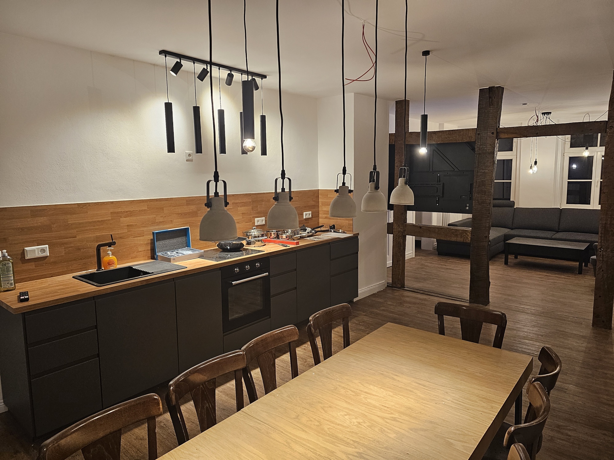 1. & 2.OG komplett, 4 große Wohn- & Esszimmer je mit Küchenzeile (Induktionsherd, Umluftbackofen, Spülmaschine), Bäder mit XXL Dusche sowie eins zusätzlich mit Whirlpool Wanne, 9 Schlafzimmer mit Kingsize Doppelbetten oder Einzelbetten, 4x Smart TV, Gigabit Internet