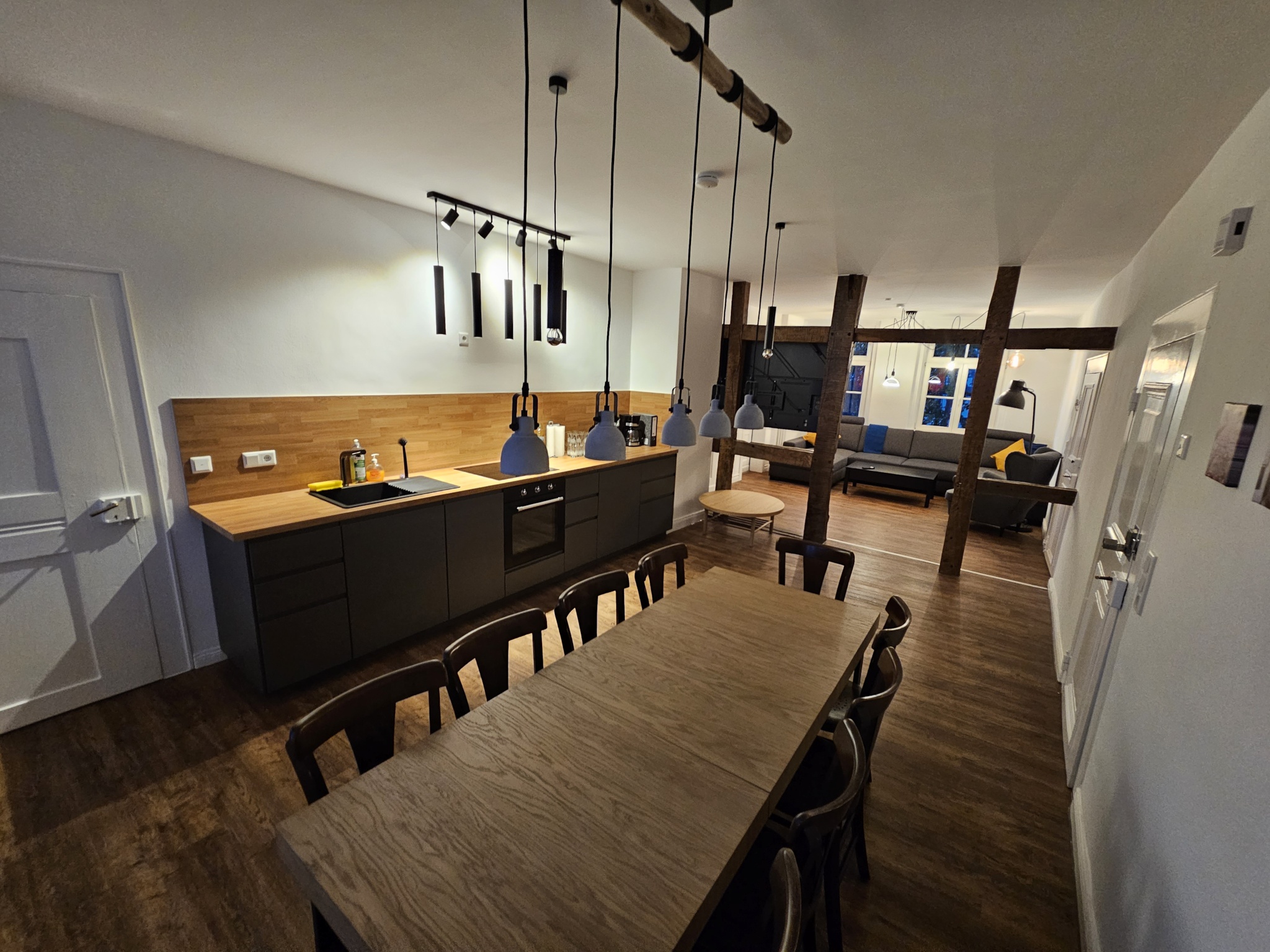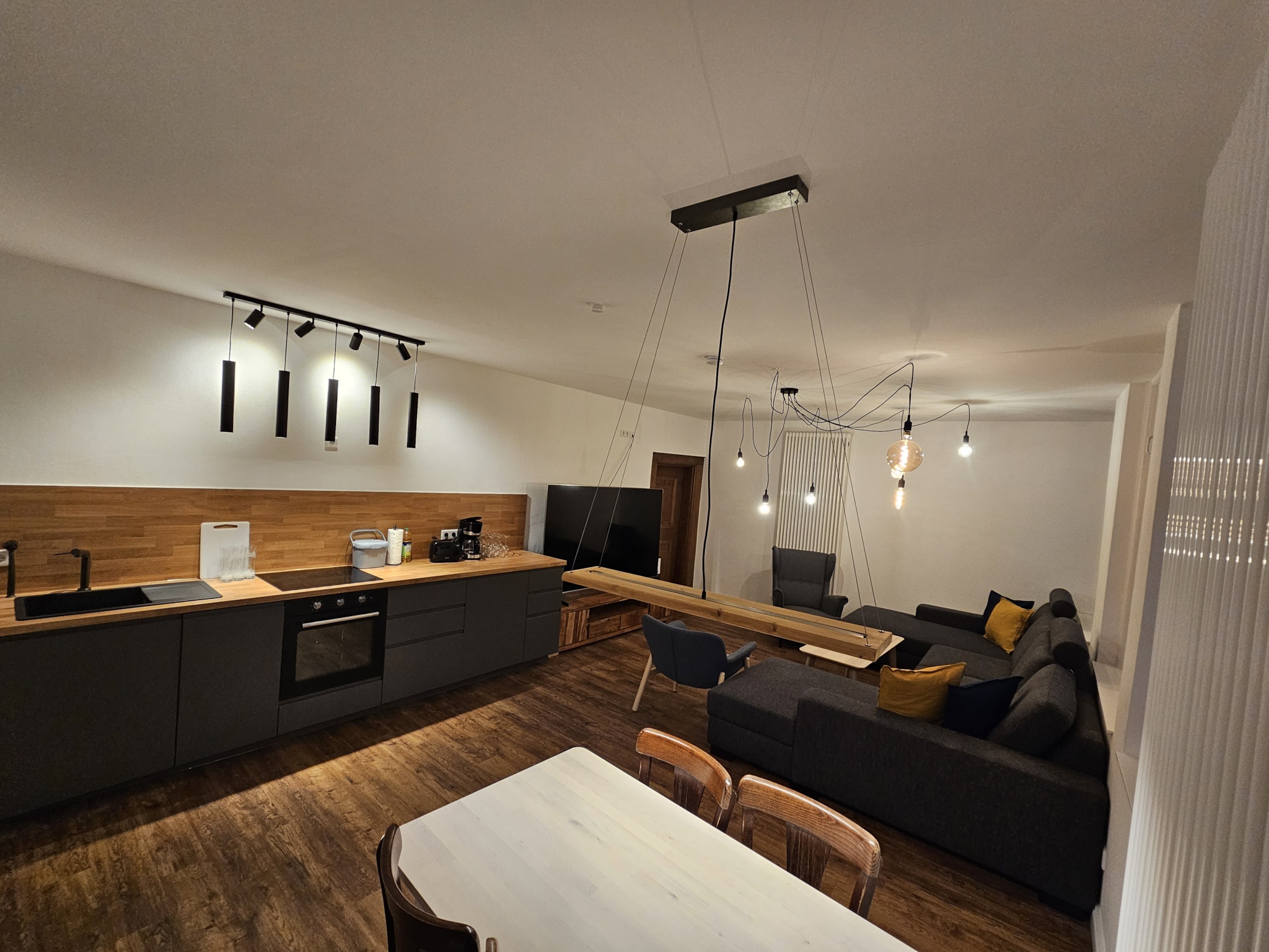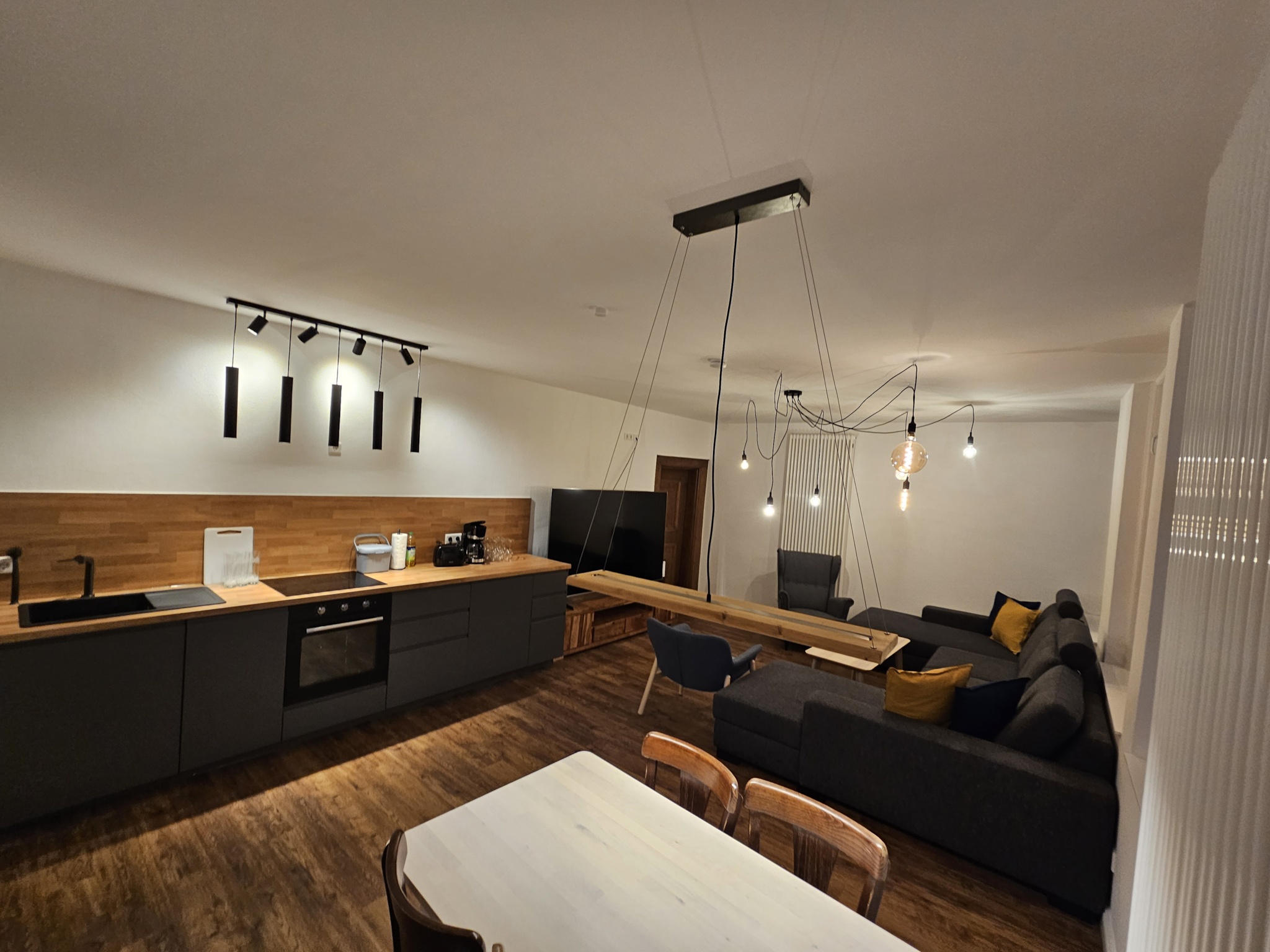 Im 2.OG gelegen, erreichbar über das großzügige Treppenhaus, Großes Wohn- & Esszimmer mit Küchenzeile (Induktionsherd, Umluftbackofen, Spülmaschine), Tageslichtbad mit Dusche, Schlafzimmer mit Kingsize Doppelbett, Smart TV, Gigabit Internet