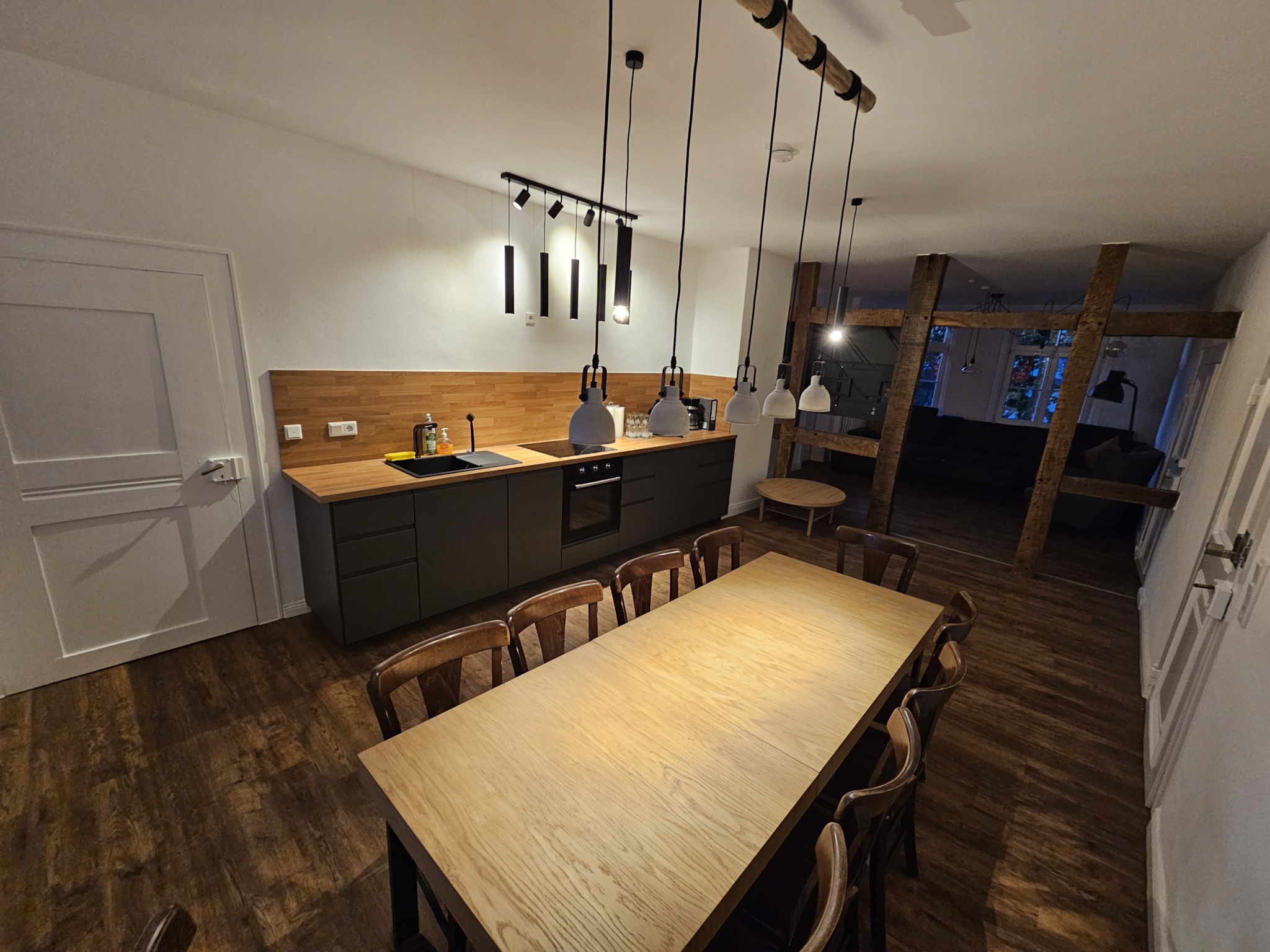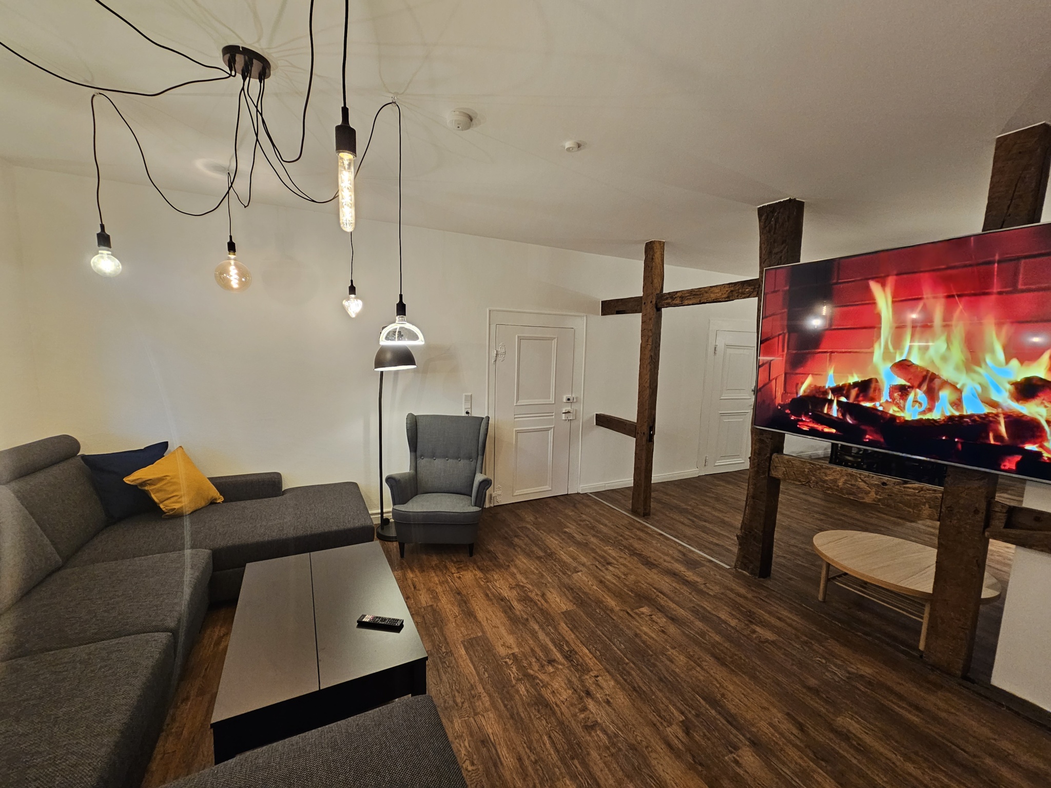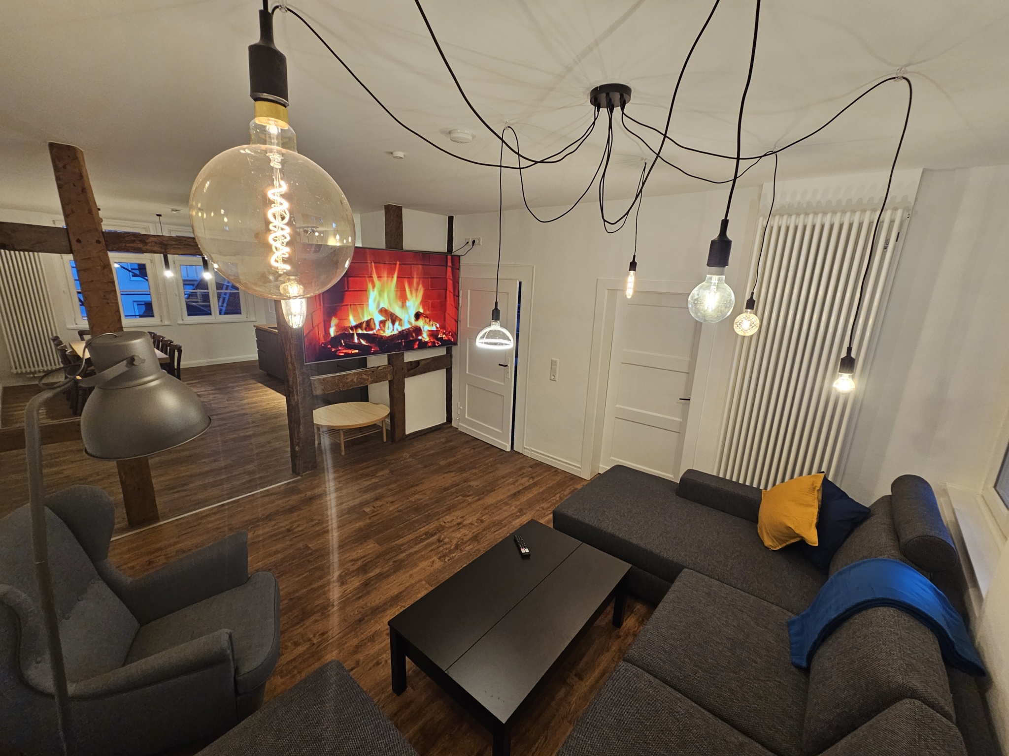 Im 2.OG gelegen, erreichbar über das großzügige Treppenhaus, Großes Wohn- & Esszimmer mit Küchenzeile (Induktionsherd, Umluftbackofen, Spülmaschine), Tageslichtbad mit Dusche, Schlafzimmer mit Kingsize Doppelbett, Smart TV, Gigabit Internet